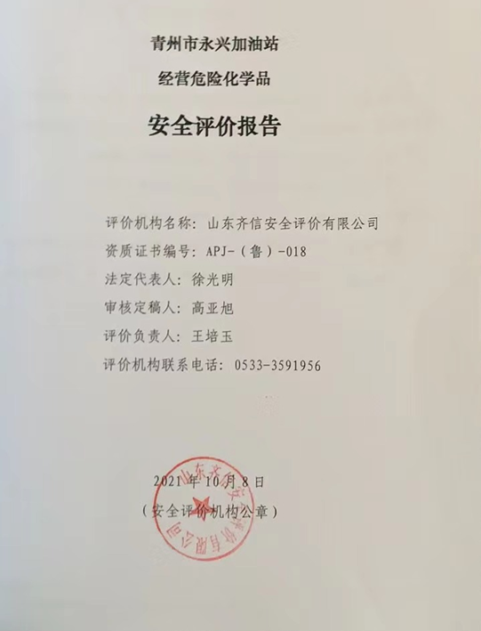 青州市永兴加油站位于青州市何官镇后演马村前史路东侧,该站成立于1995年10月22日,2020年12月17日取得青州市行政审批服务局核发的新的营业执照,投资人为赵国林。该加油站主要从事汽油和柴油的经营,经营方式为零售。 该站于 2020年11月26日取得成品油零售经营批准证书,该加油站成品油零售经营批准证书有效期为2020年11月26日至2025年11月26日(证书编号:鲁油零售证书第3707113069号)。该站持有的《危险化学品经营许可证》(证书编号:鲁潍危化经[2018]007028号),有效期自2018年10月26日至2021年10月25日。该加油站在营业期间未发生安全事故。 该加油站主营汽油、柴油等成品油,共有加油机4台,其中单枪汽油加油机1台,双枪汽油加油机1台,双枪柴油加油机1台,四枪柴油加油机1台,汽油主要经营92#、95#,柴油冬季经营-10#,其它季节经营0#。无自助加油机。该站设有埋地卧式内钢外玻璃纤维增强塑料双层储油罐5台,其中1台15m3汽油罐,1台30m3汽油罐,3台30m3柴油罐,柴油折半后计入加油站储罐总容积为90m3,该站为三级加油站。该站采用自吸式加油工艺,每台加油机设置独立的供油管线,供油管线未从站房底下通过。油罐设置了高液位报警,安装了卸油防满溢装置,当容量达到90﹪时自动报警,容量达到95﹪时自动切断进油,可以有效避免油料溢罐引发的安全事故,安全现状得到极大改善,加油站设置了UPS不间断电源,保证紧急停电下安全设施设备正常运转。 |