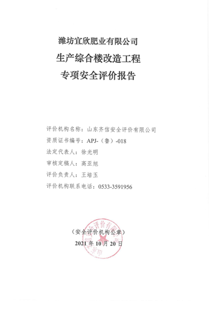 潍坊宜欣肥业有限公司于2011年8月4日经昌乐县工商行政管理局注册成立,公司注册资本206万元,注册地址为昌乐县五图街道项目区路南侧、东村路东侧,公司法人代表为甄庆梅,2015年12月11日由昌乐县市场监督管理局核发新的营业执照。该公司经营范围为:复合肥生产、销售;氮肥、磷肥、钾肥、有机肥、微生物肥销售。该公司现有职工30人,其中技术管理人员1人,专职安全管理人员1人。 潍坊宜欣肥业有限公司根据本公司实际情况,将原配件库更改使用性质,作为生产综合楼使用。本次生产综合楼改造项目仅将原有配件库更改为生产综合楼,不涉及投资。 |