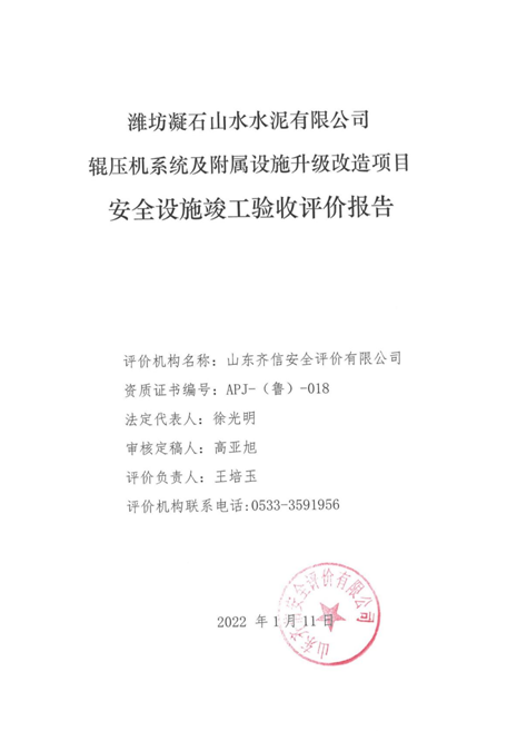 潍坊凝石山水水泥有限公司辊压机系统及附属设施升级改造装置生产技术、工艺成熟可靠,符合国家有关法规、标准。该项目的消防设施应尽快完善消防验收手续。装置已安全试运行,未发生事故。 (1)项目所在地的安全条件和与周边的安全防护距离符合规范要求。 (2)项目已采用的安全设施水平达到安全生产的要求。 (3)通过项目试生产,该项目采用的技术、工艺和装置、设备安全可靠。 (4)项目试生产中发现的所有设计缺陷已进行了整改,现场存在的事故隐患已全部整改。 (5)通过项目试生产,该项目已具备国家现行有关安全生产法律、法规和部门规章及标准、规范规定和要求的安全生产条件。 通过对潍坊凝石山水水泥有限公司辊压机系统及附属设施升级改造装置建设项目的外部安全条件、总平面布置、主要装置、安全管理和公用工程等方面的评价,该项目完善消防验收手续后具备安全验收条件。 |