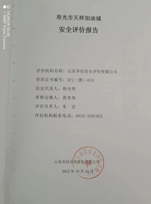 寿光市天祥加油城成立于2002年07月12日,注册地位于潍坊市寿光市开发区北环路北侧,法定代表人为李树文。经营范围包括零售:汽油、柴油(有效期限以许可正为准)、润滑油(依法需经批准的项目,经相关部门批准后方可开展经营活动)。类型为个人独资企业。 该加油站原有 5 台储罐,容积均为 30m3 ,其中汽油罐3台,柴油罐2台。罩棚下设 16 台双枪单油品加油机、3台CNG 加气机(1台CNG加气机已停用),站房 1 座及其他附属设施。该加油站储罐总容积为 120m3(柴油罐容积折半计入油罐总容积),CNG加气设备设施未发生变动,站内储气井容积为 8m3,《汽车加油加气加氢站技术标准》(GB50156-2021)第3.0.15条之规定为二级合建站。 该加油站已取得成品油零售经营批准证书,证书编号为:鲁油零售证书第 3707123050号,有效期至2026年01月18日。2019年11月12日取得了危险化学品经营许可证,证书编号为:鲁潍危化经[2019]005171号,有效期至2022年11月12日。 该加油站现有职工11人,其中站长1人,安全员1人,站长和安全员已通过安全生产知识和管理能力考核合格,并取证。 依据《中华人民共和国安全生产法》(中华人民共和国主席令[2002]第70号,根据2021年6月10日中华人民共和国第十三届全国人民代表大会常务委员会第二十九次会议《全国人民代表大会常务委员会关于修改〈中华人民共和国安全生产法〉的决定》修正)、《危险化学品安全管理条例》(国务院令第591号,根据国务院令第645号修订)、《危险化学品经营许可证管理办法》(国家安全生产监督管理总局令第55号,根据安监总局令第79号修订)的要求,危险化学品经营许可证换发需进行安全评价,因此,寿光市天祥加油城委托山东齐信安全评价有限公司进行经营危险化学品安全评价。 接受委托后,山东齐信安全评价有限公司成立评价组,在进行资料与标准收集、现场调研、项目资料分析、危险与有害因素分析的基础上,依据《安全评价通则》(AQ8001-2007)、《山东省加油站安全评价导则》(鲁安监发〔2006〕114号),通过对该加油站安全管理、站址选择及总平面布置、加油工艺及设施、其他设施等方面的审查,选择相应的评价方法对其危险、有害因素进行辨识和评价,编写完成了《寿光市天祥加油城安全评价报告》。 |