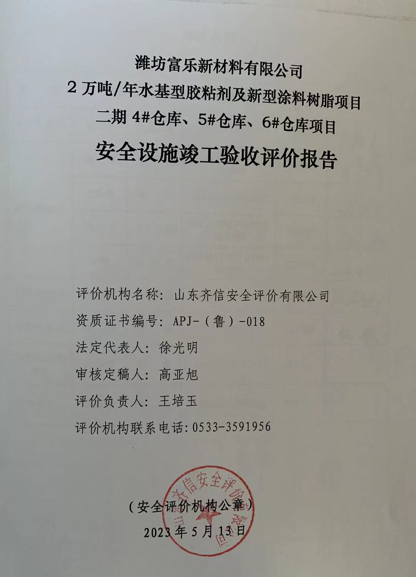 潍坊富乐新材料有限公司是由济南卡夫乐化工有限公司投资兴建,成立于2011年7月4日,注册资本贰仟伍佰万元整,地址位于昌邑市滨海(下营)经济开发区,法定代表人孟祥治,企业类型为有限责任公司(自然人投资或控股),公司经营范围:丙烯酸树脂4000t/a、聚酯树脂2000t/a、水性压敏胶4000t/a。 该公司为了提高厂区物料储存能力,提升安全生产条件,企业投资500万元在其厂内预留空地建设了“2万吨/年水基型胶粘剂及新型涂料树脂项目二期4#仓库、5#仓库、6#仓库”项目。该项目于2020年7月15日取得山东省建设项目备案证明,项目代码:2020-370786-47-03-069287,建设起止年限为 2020 年至2022年。目前该项目已经建成。 该项目4#仓库(乙类)、5#仓库(乙类)、6#仓库(乙类)内储存物料丙烯酸树脂、聚酯树脂、水性压敏胶、水性聚氨酯、包装桶等,其中丙烯酸树脂、聚酯树脂属于危险化学品,依据《危险化学品建设项目安全监督管理办法》(国家安全生产监督管理总局令第45号,国家安全监督管理总局令第79号修正),该项目为危险化学品储存建设项目。 潍坊富乐新材料有限公司2万吨/年水基型胶粘剂及新型涂料树脂项目分两期建设。该项目一期已建成投产,主要包括4000t/a水性压敏胶生产装置、4000t/a丙烯酸树脂生产装置、2000t/a聚酯树脂生产装置、1#仓库、2#仓库、3#仓库及原料罐区(北侧8台卧式储罐,容积均为50m3),现处于正常生产使用阶段;该项目二期工程已竣工,主要包括:4000t/a水性压敏胶生产装置、4000t/a丙烯酸树脂生产装置、2000t/a水性聚氨酯生产装置及原料罐区(南侧8台卧式储罐,容积均为50m3),现待试生产。具体情况见下表: |