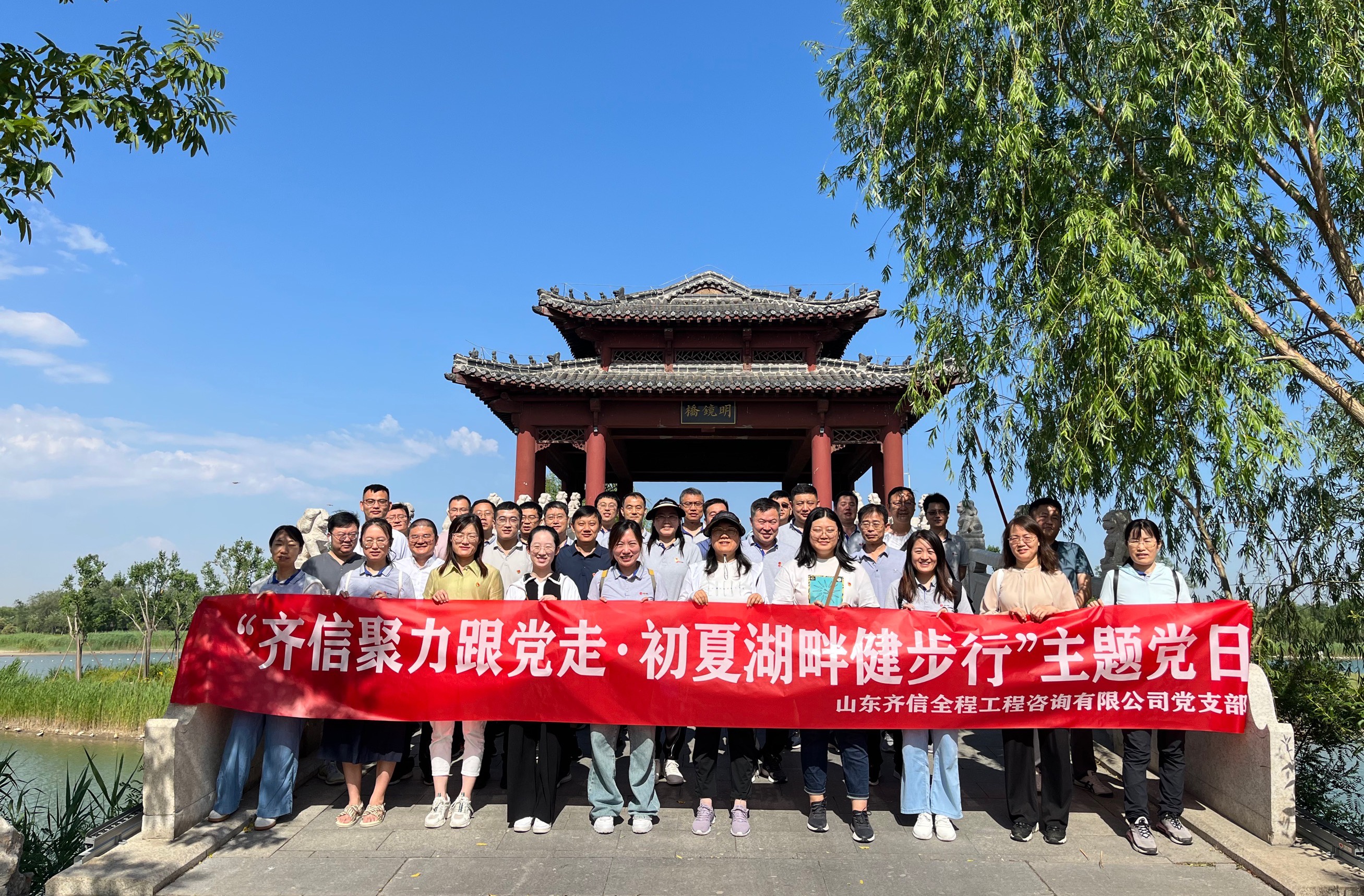 在七一党日来临之际,6月10日,齐信党支部组织公司全体党员、中层及以上领导干部在马踏湖国家湿地公园开展“齐信聚力跟党走,初夏湖畔健步行”主题党日。本次活动邀请了淄博高新区非公企业党委委员、工信商务局副局长王承伟同志、结对共建单位淄博职业学院建筑工程学院党支部的部分老师们参加。