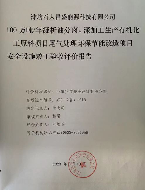 潍坊石大昌盛能源科技有限公司成立于 2011 年 11 月 29 日,注册地址潍坊市滨海经济开发区创新街 05667 号,位于潍坊滨海化工产业园内,法定代表人郭明文,主要负责人郭明军,类型为其他有限责任公司,注册资本壹亿元整,总用地面积 713843m²。经营范围包括许可项目:危险化学品经营;危险化学品生产。一般项目:石油制品制造(不含危险化学品)。 该公司现有员工 306 人,设置安全总监 1 人,成立了安全管理机构—安全部,专职安全生产管理人员 7 人,其中 4 人为注册安全工程师。此外,各生产车间、部门共配备兼职安全生产管理人员 9 人。该公司现有 100 万吨/年凝析油分离装置、40 万吨/年芳烃抽提装置、60万吨/年加氢芳构化装置、15000Nm³/h 甲醇 PSA 制氢装置、2.5 万吨/年硫氢化钠装置、30 万吨重质油轻质化装置、8 万吨/年液体二氧化碳装置正常运行,10000Nm³/h 燃料电池用高纯氢提纯及充装项目在试生产阶段。 该公司于 2023 年 3 月 17 日换发了安全生产许可证,编号(鲁)WH 安许证字〔2023〕070485 号,有效期自 2023 年 3 月 17 日至 2026 年 03 月 16日。许可范围:液化石油气 5.04 万吨/年、丙烷 0.74 万吨/年、异丁烷 2.5 万吨/年、正丁烷 1.8 万吨/年、苯 8.36 万吨/年、甲苯 4 万吨/年、二甲苯异构体混合物 11.67 万吨/年、石脑油 12.52 万吨/年、异戊烷 2 万吨/年、正戊烷 2.24万吨/年、环戊烷 0.5 万吨/年、异己烷 0.5 万吨/年、正己烷 0.5 万吨/年、环己烷 0.5 万吨/年、庚烷 0.5 万吨/年、6#溶剂油 1 万吨/年、120#溶剂油 1.64万吨/年、200#溶剂油 0.5 万吨/年、航空煤油 2 万吨/年、重质苯 14.5 万吨/年、硫氢化钠 2.5 万吨/年、轻质白油 W120 1.28 万吨/年、轻质白油 W1401.29 万吨/年、二氧化碳【压缩的或液化的】8 万吨/年***。 |
