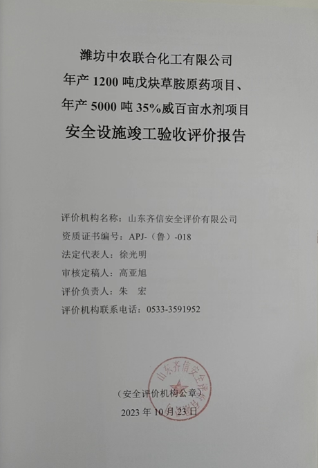 潍坊中农联合化工有限公司年产1200吨戊炔草胺原药项目、年产500035%威百亩水剂项目安全设施竣工验收评价报告