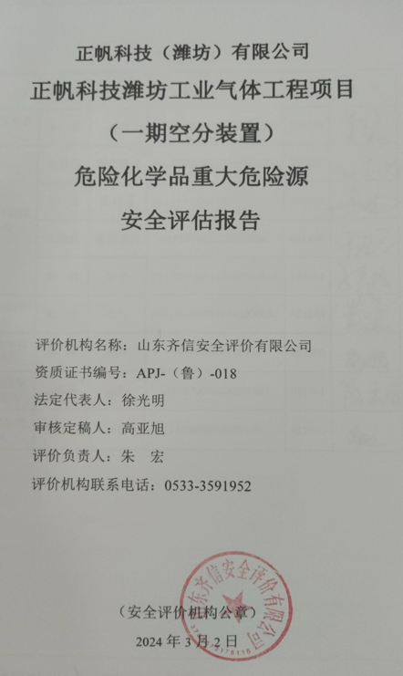 正帆科技(潍坊)有限公司成立于2021年06月03日,企业类型为有限责任公司(港澳台投资、非独资),注册地位于潍坊滨海经济技术开发区大家洼街道黄海路以西、规划支路以南,法定代表人为史可成,注册资本2000万美元,经营范围包括一般项目:工程和技术研究和试验发展;基础化学原料制造(不含危险化学品等许可类化学品的制造);特种设备出租;机械设备租赁;陆地管道运输;气体、液体分离及纯净设备销售;电子专用材料制造;电子专用材料销售;仪器仪表销售;半导体器件专用设备销售;机械电气设备销售;光伏设备及元器件销售;电子产品销售;技术服务、技术开发、技术咨询、技术交流、技术转让、技术推广。(除依法须经批准的项目外,凭营业执照依法自主开展经营活动)许可项目:道路货物运输(含危险货物);水路危险货物运输;移动式压力容器/气瓶充装;药品批发;药品零售。(依法须经批准的项目,经相关部门批准后方可开展经营活动,具体经营项目以相关部门批准文件或许可证件为准)。 为增加公司的业务辐射范围,与公司现有产品产生协同效应,提高公司市场竞争优势,上海正帆科技股份有限公司计划由全资子公司上海徕风工业科技有限公司与香港正帆国际贸易有限公司共同出资新设全资孙公司正帆科技(潍坊)有限公司,在潍坊滨海经济技术开发区实施正帆科技潍坊工业气体工程项目。项目分二期建设,一期为生产氧氮氩的空气分离装置,二期工程为单氮空分及钢瓶充装生产线。一期项目于2023年4月开工建设,于2024年2月建设完成。 为贯彻执行《中华人民共和国安全生产法》、《危险化学品安全管理条例》和《危险化学品重大危险源监督管理暂行规定》(国家安监总局令第40号,依据第79号修正)的相关要求,正帆科技(潍坊)有限公司委托山东齐信安全评价有限公司对正帆科技(潍坊)有限公司正帆科技潍坊工业气体工程项目(一期空分装置)进行危险化学品重大危险源安全评估。 山东齐信安全评价有限公司评价人员依据相关的安全生产法律、法规、标准、条例和规范,在对该公司厂区仔细分析、认真考察的基础上,采用适当的评价方法,对该公司危险化学品重大危险源作出科学的评价和分析,并编制完成了该公司的危险化学品重大危险源安全评估报告。 |