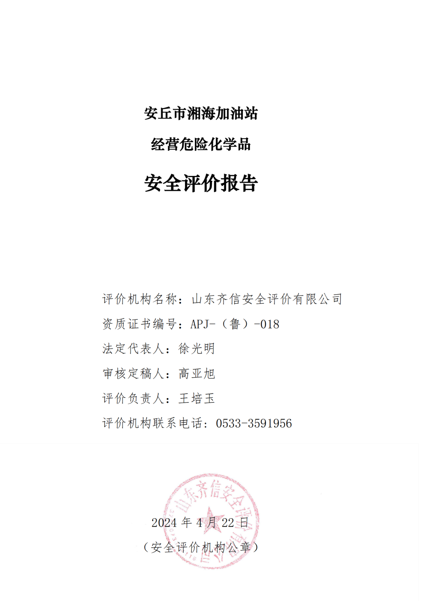 安丘市湘海加油站位于安丘市凌河镇东下小路北,成立于 2012 年 07 月 10 日,企业类型为个人独资企业,2016 年 03 月 22 日取得安丘市市场监督 管理局核发新的营业执照,投资人为刘海波。该加油站主要从事汽油和柴油 的经营,经营方式为零售。 该站于 2021 年 08 月 24 日取得《成品油零售经营批准证书》(证书编 号:鲁油零售证书第 3707063085 号),有效期自 2021 年 08 月 24 日至 2026 年 08 月 24 日。该站持有的《危险化学品经营许可证》(证书编号:鲁潍危 化经[2021]008110 号),有效期自 2021 年 06 月 18 日至 2024 年 06 月 17 日。 该加油站在营业期间未发生安全事故。 该加油站现有从业人员6 人,其中安全管理人员 1 名。该站已建立了安 全生产责任制度、安全管理制度和安全操作规程等,制定了生产安全事故应 急救援预案,成立了安全生产领导小组,配备了安全员,主要负责人和安全 员取得了安全生产知识和管理能力考核合格证。其他从业人员经本单位培训考核合格。 该加油站主营汽油、柴油等成品油,共有双枪加油机 4 台,加油机呈南 北两排布置,北侧一排两台加油机自西向东依次为 95#/95#、-10#/0# ,南侧一 排两台加油机自西向东依次为 92#/92#、0#/0#,无自助加油机。该站设有埋地 卧式内钢外玻璃纤维增强塑料双层储油罐 4 台,其中汽油储罐 2 台,容积均 为 25m3 ,柴油储罐 2 台,容积均为 25m3 ,(自北向南依次为 92# 、95# 、0#、 -10#),柴油折半后计入加油站储罐总容积为 75m3 ,该站为三级加油站。该 站采用自吸式加油工艺,加油管道为双层复合管材,管道最低点设检漏点,进油、通气、油气回收系统管道为流体输送用无缝碳钢管材,加油工艺管道 全部埋地设置,且不穿越站房。加油机加油软管设置安全拉断阀;油罐设有 带有高液位报警功能的液位监测报警系统等信息化设备。加油机机体、营业 室内设置紧急切断按钮,并实现手动复位。加油站设有油罐渗漏检测立管、 汽油卸油油气回收系统、加油油气回收系统和三次油气回收系统。 |