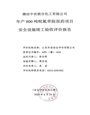 潍坊中农联合化工有限公司成立于2006年10月27日,注册资本12740万元,为有限责任公司(自然人投资或控股的法人独资),法定代表人苑文强,位于潍坊滨海经济开发区临港化工园内,总占地面积162亩。 潍坊中农联合化工有限公司是国家定点农药生产企业,属于山东中农联合生物科技股份有限公司的全资子公司。山东中农联合生物科技股份有限公司是中国农资集团投资控股企业,以生物农药、中间体及精细化工产品的生产和销售为主营业务。 潍坊中农联合化工有限公司投资建设了年产800吨吡氟草胺项目(以下称该项目)。该项目于2021年9月1日取得山东省建设项目备案证明,项目代码:2109-370772-04-01-321521。该项目由山东奥萨斯安全咨询评价有限公司编制了设立安全评价报告,于2022年6月13日潍坊市应急管理局出具了危险化学品建设项目安全审查意见书,编号:潍应急危化项目审字[2022]0044号;由山东天浩工程设计有限公司编制了安全设施设计专篇并出具了施工图,2023年4月4日潍坊市应急管理局出具了危险化学品建设项目安全审查意见书,编号:潍应急危化项目审字[2023]0022号。该项目施工单位为江苏威达建设集团有限公司,监理单位为济南石油化工设计院。该项目于2023年4月开工建设,2023年9月竣工。项目建设完成后由设计单位、施工单位、监理单位、建设单位签署了建设工程交工验收报告。企业在试生产前组织厂内相关人员编制了试生产方案,并委托山东奥萨斯安全咨询评价有限公司编制了试生产条件安全评价报告,聘请专家对试生产方案进行了评审、对试生产条件进行了确认,对专家提出的意见进行了整改。 该项目为新建项目,产品为吡氟草胺,副产品为31%盐酸、亚硫酸钠,其中副产品31%盐酸于危险化学品,因此该项目属于危险化学品生产建设项目。 根据《中华人民共和国安全生产法》、《危险化学品安全管理条例》、《山东省安全生产条例》、《危险化学品建设项目安全监督管理办法》等法律法规要求,该项目建设完成后应进行安全设施竣工验收评价。 受潍坊中农联合化工有限公司委托,山东齐信安全评价有限公司承担了该项目的安全设施竣工验收评价。双方签订《安全评价技术服务合同》后,山东齐信安全评价有限公司确定项目负责人,成立评价项目组,根据国家有关安全生产法律法规、行政规章及标准规范要求,通过对企业提供的资料进行分析和现场检查,结合其生产的实际情况,运用科学的评价方法进行定性、定量分析,提出合理、可行的安全对策措施及建议,并按照《安全验收评价导则》(AQ8003-2007)、《危险化学品建设项目安全评价细则(试行)》(安监总危化[2007]255号)和有关法规、技术标准、文件的规定与要求编制完成了本评价报告。潍坊中农联合化工有限公司应对提供资料的真实性负全部责任。 |