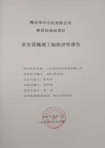 潍坊华中石化有限公司新昌加油站成立于2024年01月17日,注册地位于山东省潍坊高新区新昌街道寨子社区健康街高二路东1公里路北1幢106,负责人为王树振。经营范围包括一般项目:石油制品销售(不含危险化学品);润滑油销售;洗车服务;汽车拖车、求援、清障服务;日用百货销售。(除依法须经批准的项目外,凭营业执照依法自主开展经营活动)。 潍坊华中石化有限公司于2022年7月29日取得了由潍坊高新技术产业开发区科技统计局颁发的《关于对山东壳牌石油有限公司潍坊清池街南加油站原址改建的申请批复》,潍坊华中石化有限公司对山东壳牌石油有限公司潍坊清池街南加油站进行原址改建。改建后加油站名称:潍坊华中石化有限公司新昌加油站。 该加油站项目的设立安全评价单位为山东实华安全技术有限公司,设计单位为 山东鸿运工程设计有限公司,施工单位为兴润建设集团有限公司。该项目于2024年5月7日开始建设,2024年8月27日建成。 根据《中华人民共和国安全生产法》(中华人民共和国主席令[2002]第70号,根据2021年6月10日中华人民共和国第十三届全国人民代表大会常务委员会第二十九次会议《全国人民代表大会常务委员会关于修改〈中华人民共和国安全生产法〉的决定》修正)、《危险化学品建设项目安全监督管理办法》(国家安全生产监督管理总局令第45号,总局令79号修订)、《建设项目安全设施“三同时”监督管理办法》(国家安全生产监督管理总局令第36号,总局令77号修订)、《山东省危险化学品建设项目安全监督管理办法实施细则》(鲁安监发[2018]17号)的规定,在该加油站项目竣工后,应对其设备、设施及管理状况进行评价,为该加油站项目安全验收提供依据。为此,潍坊华中石化有限公司委托山东齐信安全评价有限公司对“潍坊华中石化有限公司新昌加油站项目”进行安全设施竣工验收评价。 我公司接受委托后,立即成立了由专业评价师组成的评价小组,依据安全设施竣工验收评价的工作程序,在对项目相关资料充分了解和分析的基础上,根据安全设施竣工验收评价工作的有关要求,编制了安全设施竣工验收评价工作计划书,并结合该项目的特征,编制了安全设施竣工验收评价检查表,进行了现场调研,对该项目的安全措施及设施进行了检查,通过对该项目相关资料的汇总、分析和处理,对该项目进行了安全设施竣工验收评价,并编制完成了安全设施竣工验收评价报告书。 |